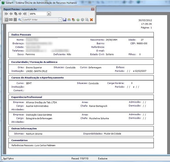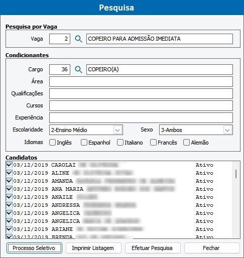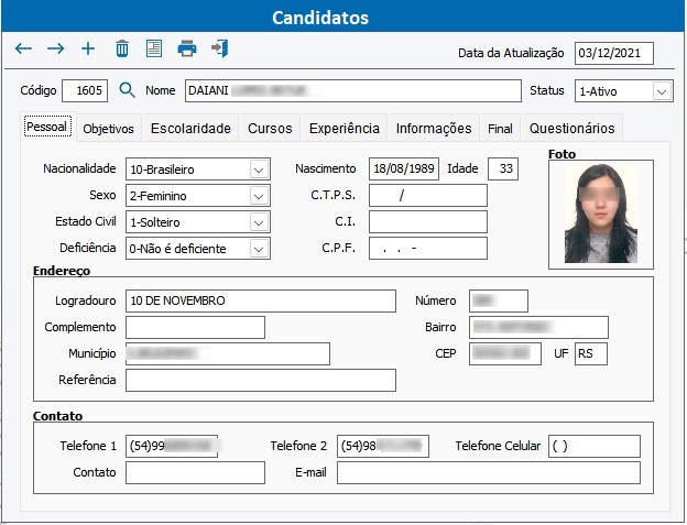Controla os candidatos através do cadastro dos currículos, que pode ser integrado ao website da empresa. Permite o agendamento dos testes e entrevistas e também a personalização dos questionários. Tem o quadro de lotação para orientar a abertura de vagas e a pesquisa de candidatos pode ser parametrizada.