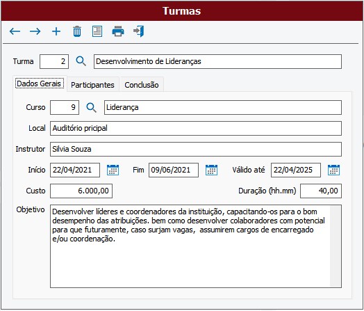 Utiliza a Matriz de Capacitação para rastrear a necessidade de desenvolvimento individual do colaborador. Permite a montagem de turmas para treinamento com avaliação de aproveitamento e emissão do respectivo certificado. A avaliação por competências pode ser configurada de acordo com as necessidades individuais de cada empresa e de acordo com o perfil de cargos.